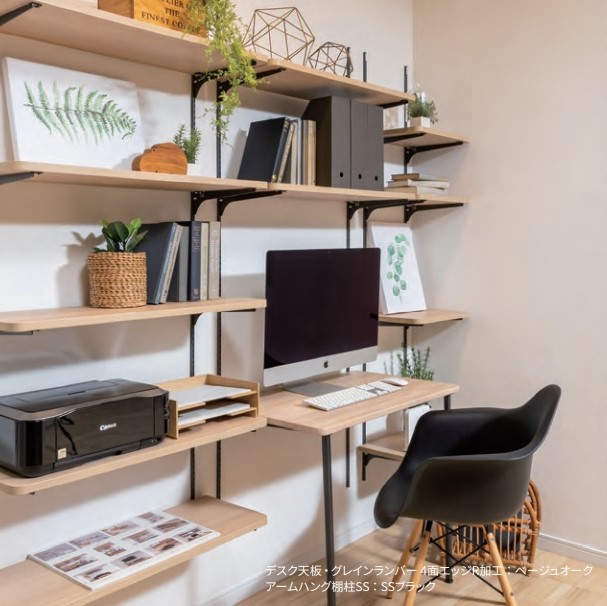 今回、南海プライウッドのアームハング棚柱シリーズに「デスク天板」と「デスク脚」パーツが新たにラインナップされました。
