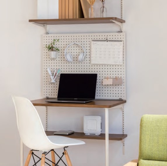 アームハング棚柱は背面壁が1面あれば取り付けられる棚柱で、場所や収納量に応じた可動棚が設置できます。