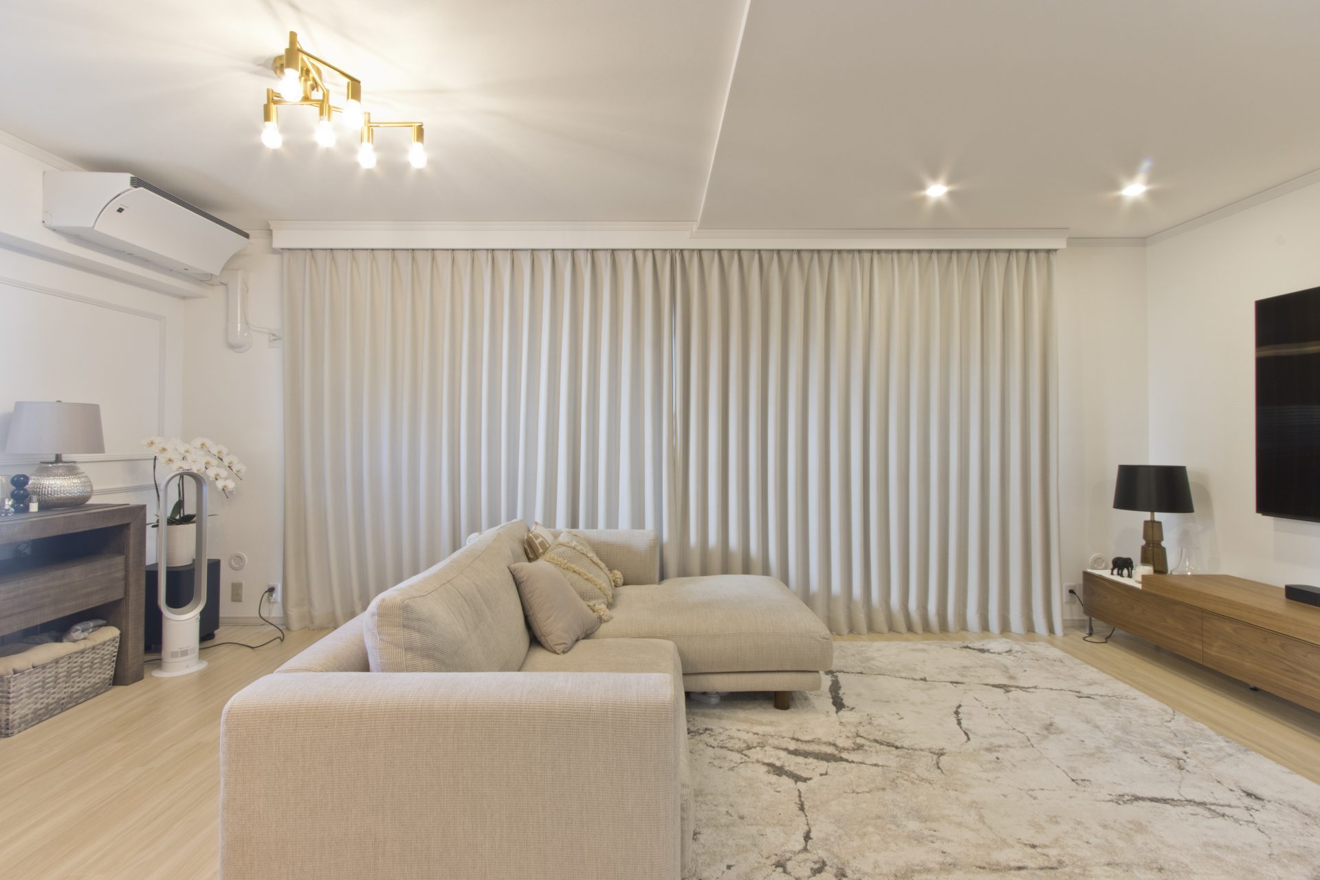 いかがでしょう?同じマンションの同じ窓ですが、天井からのカーテン設置によって窓自体が大きく見える効果が。