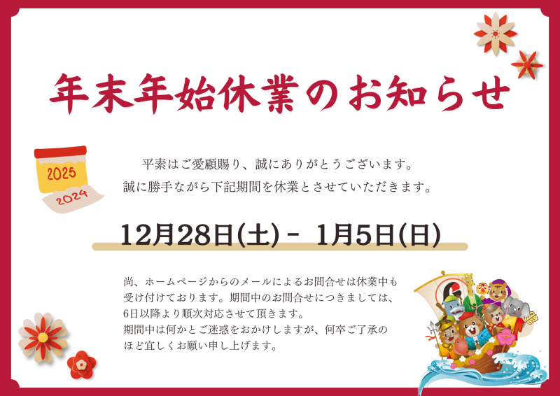 トップスタッフブログ年末年始休業のお知らせ 2024.12.21 お知らせビーバーリフォーム青山リフォーム 年末年始休業のお知らせ 日頃より当社へ格別のご愛顧を賜り、厚く御礼申し上げます。誠に勝手ながら、12/28(土)~1/5日(日)を年末年始休業期間とさせて頂きます。 尚、FAX・メールによるお問合せは休業中も受け付けております。休業中に頂いたお問合せへの回答、資料の発送等は、平常営業日より順次対応させて頂きます。 休業期間中、お客様には大変ご迷惑をおかけいたしますが、何卒ご理解とご協力をよろしくお願い申し上げます。 ビーバーリフォーム / 青山リフォーム PREV冬のあったか家づくり 窓リフォーム♪ 記事一覧へ戻る NEXT☆Merry Christmas☆
