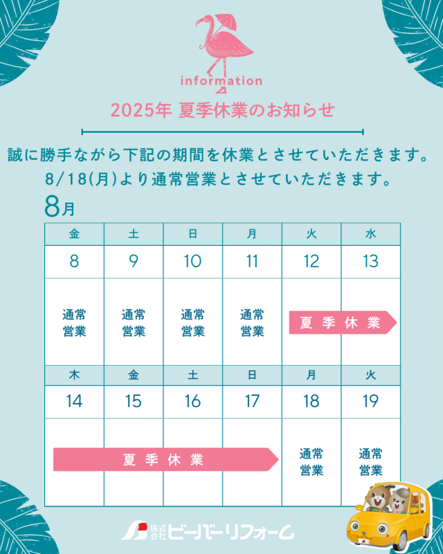 ビーバーリフォーム・藤井寺ショールームの営業日は下記の通りとさせていただきます。