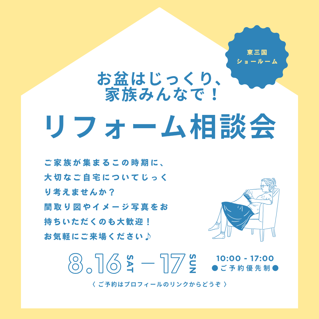 青山リフォームでは、お盆の8月16日・17日に当社ショールームにて相談会を開催いたします。