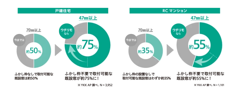 内窓は設置はできるのですが、この数字にも表れているように、これまでの内窓はふかし枠を設置しないと取付ができないお家が大半でした。マンションでは35%程度しか設置ができず、実際に弊社でも施工をするときは殆どのお客様にふかし枠を設置しての取付をお伝えしておりました。条件によっては枠が付けられない箇所もあったりと、付けたいけど付けられない・・・と諦めた方もいらっしゃったのではないでしょうか?