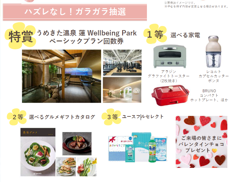 特賞は今話題のうめきた温泉の回数券!ほかにも人気家電や選べるグルメギフトカタログが当たる♪