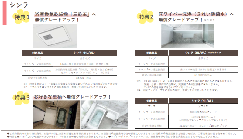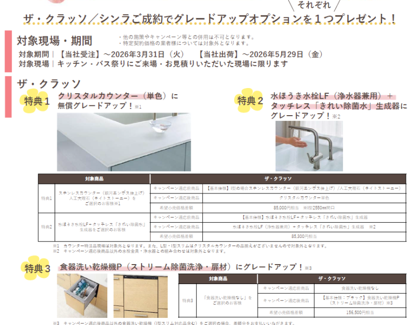 キッチン・バス祭り期間中にご来場・お見積りいただいた現場限定で、対象商品の無償グレードアップ特典をご用意しています。