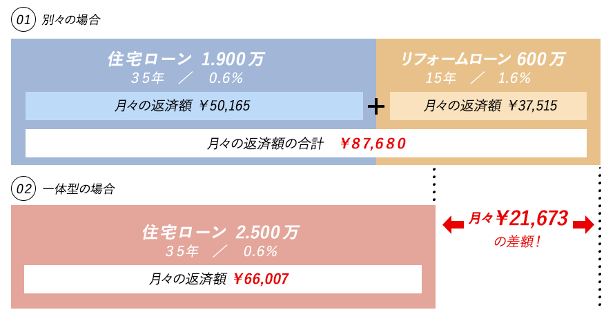 ◎リノベーション費用も物件と同じ金利と借入期間で借入していただくことで、月々の返済額を抑えることができます。