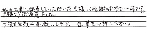 此の工事に従事していただいた皆様に感謝の気持で一杯です。有難う御座居ました。