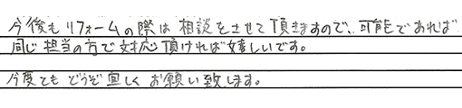 今後もリフォームの際は相談をさせて頂きますので、可能であれば同じ担当の方で対応頂ければ嬉しいです。