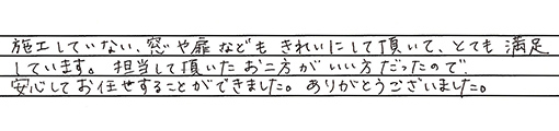 施工していない窓や扉などもきれいにして頂いて、とても満足しています。担当して頂いたお二方がいい方だったので、安心してお任せすることができました。ありがとうございました。