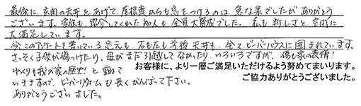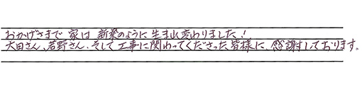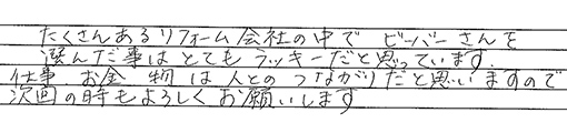 たくさんあるリフォーム会社の中でビーバーさんを選んだ事はとてもラッキーだと思っています。仕事、お金、物は人とのつながりだと思いますので、次回の時もよろしくお願いします。