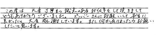 この度は、大変丁寧且つ誠意のあるお仕事をして頂きましてどうもありがとうございました。ビーバーさんにお願いして本当に良かったと大変感謝しています。また何かありましたらお願いしたいと思います。