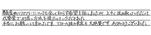 騒音やバリアフリーについても全く知らず希望を話しましたが、上手く汲み取っていただいて代替案でより良い方法を提示していただきました。本当にお願いして良かったです。リフォーム後の来客も大絶賛です。ありがとうございました。