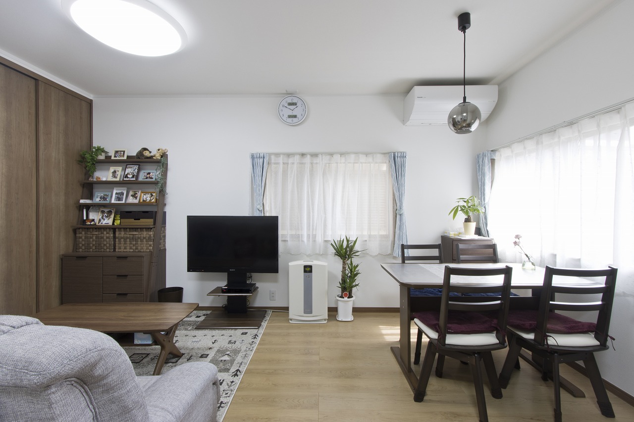 家族構成の変化や愛犬との別れ、定年退職などの様々な要因が重なりリフォームをしようと決意された O 様。一番不安だった耐震性は筋交いや金物補強で高め、制震ダンパーも導入して安心のお住まいに。さらにタンスの転倒も心配だったので、寝室にはクローゼットを造り付け、タンスを処分することで不安も解消されました。また、断熱性を高めたので暖かい家になり、結露も解消。キッチンやお風呂は最新の設備を取り入れることで、家事の負担がラクになりました。リビングを広く取るためにお風呂や階段の位置を変更し、お正月に家族が集まってもゆったりと過ごしやすい空間に。和風のデザインだった外観は洋風にガラッとイメージを替え、明るい印象になりました。キレイになったお部屋には植物や雑貨、お写真などが飾られ、玄関先やお庭には奥様が丁寧に手入れされたお花が並び、新しくなったわが家で生活を楽しんで頂いています。