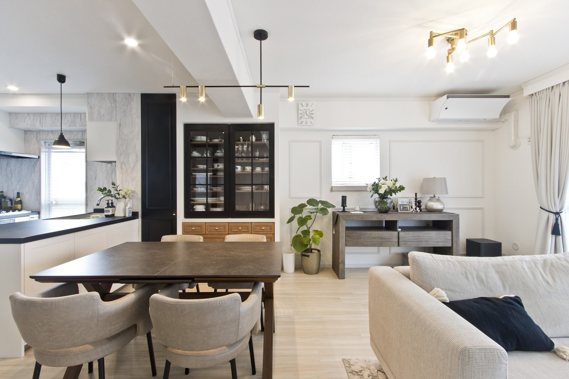 マンション 【大阪府/マンションリフォーム】リビングを広く、心地よく。お友達とお料理を楽しめる、夫婦二人のアットホームな空間 次前 ROOM PLAN3FBEFORE3FAFTER DATA 所在地 大阪市 構造 RC 築年数 27年 リフォーム面積 72.0㎡ 工期 2ヶ月 リフォーム費用 1,000万円 リフォーム部位 全面リノベーション BEFORE COMMENT大阪府/マンションリフォーム ご夫婦2人暮らしになったお住まい。リビングを広くして、お友達を呼べる場所にしたいとのご希望でした。キッチンをⅡ型の対面式にして余裕のある作業スペースを設け、お友達との食事会を楽しめるスペースを。オーダーのカップボードもインテリアのアクセントに。ご主人様のお気に入りはカーテン。天井から吊るすことで、窓が大きく見え、リビングが広く見える効果があります。 「自然とお家にいる時間が長くなり、お花を飾ったりルームウェアもこだわったりと暮らしが豊かに。あらためて家って大事だと感じました。」とお話しされるM様。海外インテリアのデザインを取り入れて、細部までこだわりとセンスが光るお家に生まれ変わりました。 お客様の声を見る KEYWORDSキッチンふたり暮らしホテルライクマンション洗面バリアフリー800〜1000万70㎡以上〜100㎡未満築25年以上〜築50年未満浴室モダントイレ趣味照明・間接照明廊下クラシックグリーン窓・室内窓・ドアラグジュアリーおもてなしLDKオリジナル家具洋室暮らしやすい・住みやすい収納癒し・くつろぎ玄関内装機能的間取り変更 その他のリフォーム実例集【大阪市/マンションリフォーム】個室もしっかり、LDKはのびやかに。角部屋を最大限に活かす住まい大阪市 Y様邸【大阪市/マンションリフォーム】「夫婦それぞれの暮らし方」60歳からの全面リフォーム大阪市 U様邸【大阪市/マンションリフォーム】暮らしやすさと心地よさを両立したジャパンディ空間T様邸【八尾市/戸建てリフォーム】定年を迎えて向き合った「これからの住まい」T様邸 リフォーム実例集一覧へ戻る